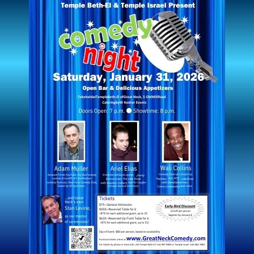 Comedians Adam Muller, Ariel Elias and Wali Collins will provide the entertainment, and Great Neck’s own Stan Levine returns as our master of ceremonies.