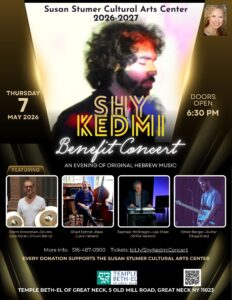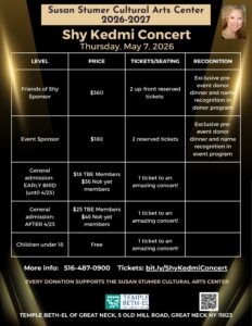 All proceeds will support the Susan Stumer Center for Cultural Arts fund, helping to ensure TBE’s place as a center for Jewish cultural arts in Great Neck.